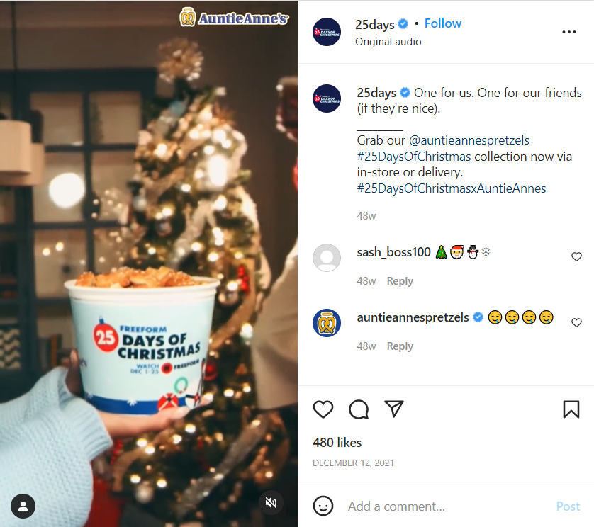 A great example of two brands coming together for holiday fun is Auntie Anne’s and Freefrom’s partnership last year. The two brands kicked off Freeform’s 25 Days of Christmas by relaunching its Snowball Nuggets and Peppermint Chocolate Frost drink. This was announced and supported on social media through a number of short-form video and photo posts on both the 25 Days and Auntie Anne’s accounts.
